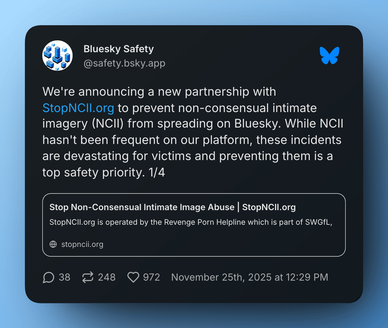Bluesky Directory Newsletter Bluesky currently has over 40.7M users320K starter packs, 105K feeds & 300K lists Bluesky partners with StopNCII To prevent the spread of non-consensual intimate imagery (NCII) on the Bluesky platform, Bluesky is partnering with StopNCII.org. https://bsky.app/profile/safety.bsky.app/post/3m6huix3ahc2m The harvest has arrived From @anisota.net, it's like Spotify Wrapped, but for your Bluesky activity. https://bsky.app/profile/anisota.net/post/3m6mwoadjbp2d Recently...