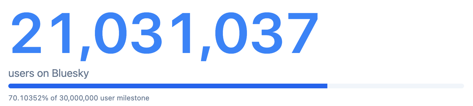 🎉 Bluesky has recently passed 21M users, the growth over the past couple of weeks has been hard to comprehend. After the post election surge, we're still seeing 5 new users per second. This was a high as 15 new users per second at one point.